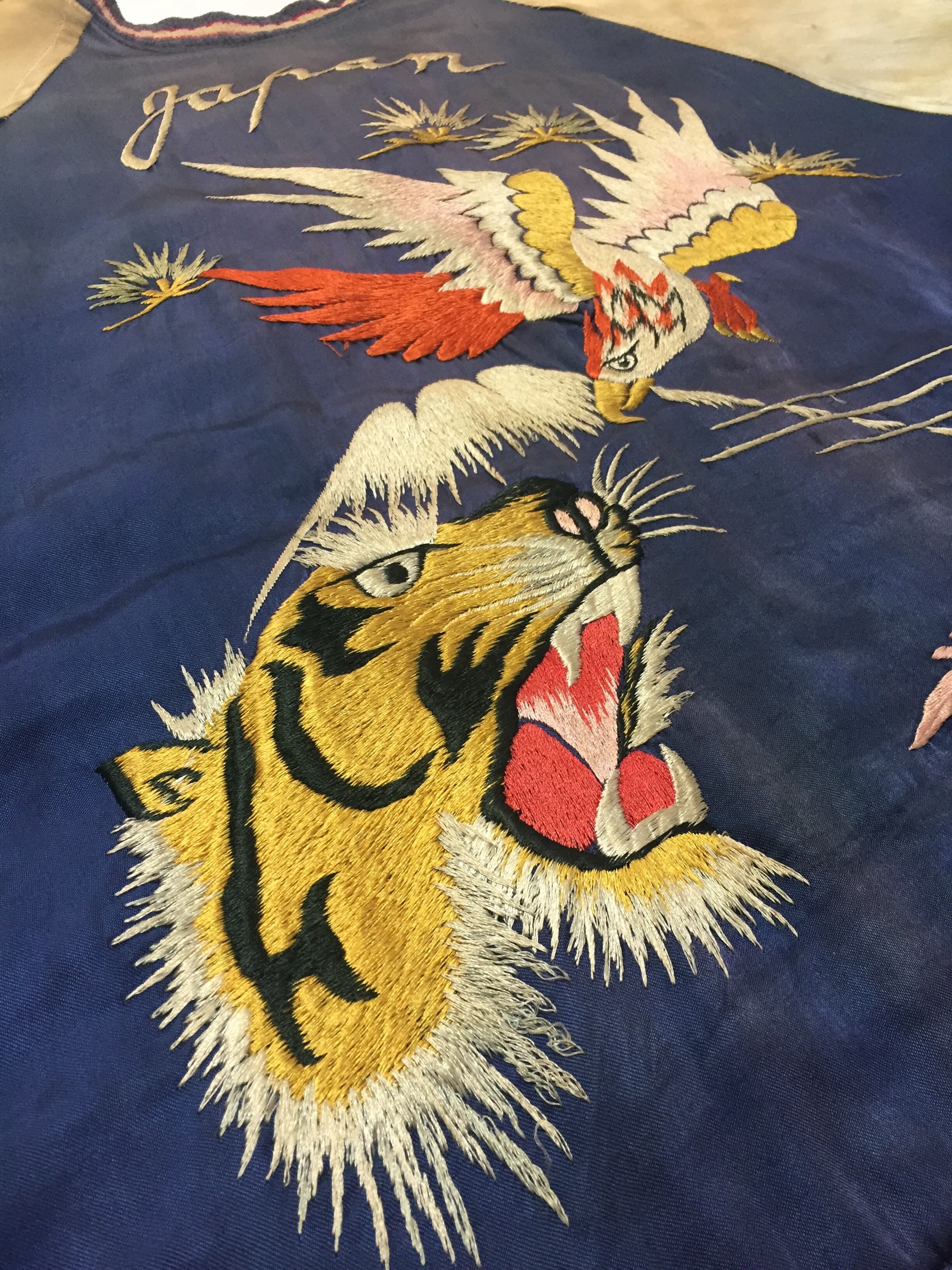 A面には顔トラと鷲、そして富士山が刺繍、B面には配色豊かな龍が刺繍された1着。